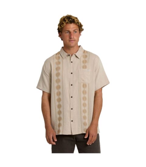 Informatie gevonden op het internet: Het betreft het artikel 24A044515. Het is een geweven overhemd met korte mouwen uit de Billabong collectie. De samenstelling is 55% linnen en 45% katoen. Het shirt heeft een regular fit, een knoopsluiting aan de voorzijde, een standaard kraag en een borstzak. Het design kenmerkt zich door verticale geprinte panelen met zon-motieven.