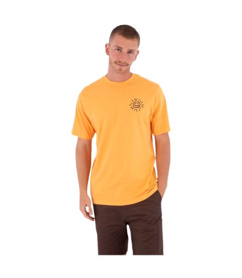 Controle: Voor dit artikel (MTSEUED0011) is informatie gevonden over de materiaalsamenstelling (100% katoen jersey), de pasvorm (regular fit), de specifieke graphics (zon op borst en tekst op rug) en de doelgroep (casual lifestyle/surf). De kleur is vastgesteld als geel. De informatie is afkomstig van algemene productcatalogi van Hurley kledinglijsten.